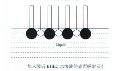 乙醇和正丁醇屬于一元醇,這兩種醇的加入能使BHEC水溶液的表面張力減小。當(dāng)未加入一元醇時,BHEC溶于水后,BHEC分子能自發(fā)地吸附在溶液的表面,使溶液的表面張力降低,表面吸附的BHEC分子越多,溶液表面張力的降幅越大,當(dāng)然這其中有一個吸附飽和的問題。但由于BHEC分子在水中處于空間交聯(lián)網(wǎng)絡(luò)結(jié)構(gòu),其定向排列時分子間存在一定的空間(見上圖)。加入乙醇或正丁醇后,醇分子可以插入BHEC分子間的空隙,使溶液表面吸附的分子達(dá)到緊密排列的狀態(tài)(見下圖),導(dǎo)致BHEC水溶液的表面張力繼續(xù)降低。