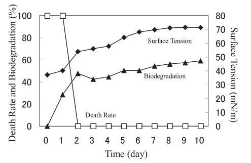 由于AE8用于商業產品,我們使用AE8來比較另一種AE。 20 mg/L AE8(圖5)的結果與20 mg/L AE9(圖4)的結果相似。 20 mg/L AE8 的死亡率隨著表面張力和生物降解率的增加也迅速下降。 測試開始后,表面張力值立即開始增加,并在第 6 天達到約 72.8 mN/m。 該結果與之前的報告 9) 以及 20 mg/L AE9 的結果相似(圖 4)。 BOD在1-2天內開始增加,并在3天后繼續逐漸增加。 至于死亡率,4天后略有增加,可能是溶解氧不足所致。