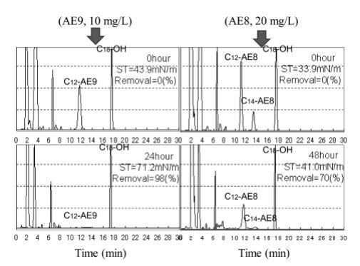 對于20 mg/L AE8,根據表面張力和死亡率的變化在10天時重新添加,趨勢與20 mg/L AE9的情況相似。 在重新添加后 48 小時觀察到 20 mg/L AE8 的 HPLC 峰,峰面積表明此時保留了約 30% 的 AE8(圖 17)。 這一事實表明,如果 AE 的濃度增加超過 20 毫克/升,重新添加后 AE 的生物降解速度相當緩慢。 可以假設 20 mg/L AE 的負載對于本研究中的細菌活性來說太重了。 然而,如果濃度低于 10 毫克/升,無論有沒有馴化,都獲得了極好的生物降解性。