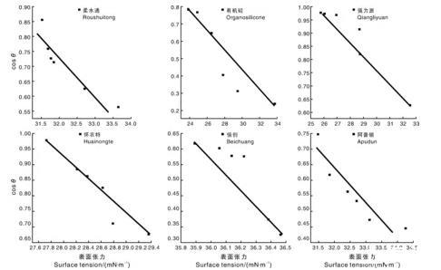 圖2阿維菌素表面張力與接觸角的關(guān)系