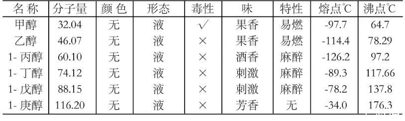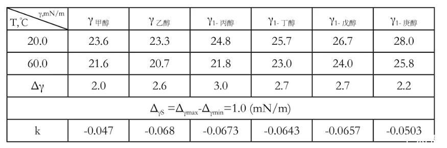 由于不同液態醇類的液態性質不同,其表面張力變化的程度如下表: