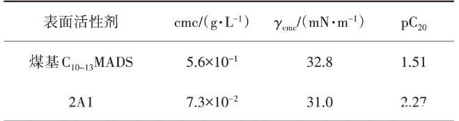 由表1可以看出,2A1的cmc低于C10~13MADS,即形成膠束的能力更強,這是由于2A1的親水性低于C10~13MADS,疏水作用強,有利于形成膠束。2A1的pC20值大于煤基C10~13MADS,說明2A1在去離子水溶液中降低溶液表面張力的效率高于C10~13MADS。對于碳氫鏈型表面活性劑,氣/液界面處的—CH3密度對其表面活性起著很重要的作用,—CH3密度的增大有利于溶液表面張力的降低,同時γcmc值也逐步降低。由表1可以看出,煤基C10~13MADS的γcmc大于2A1,這是由于2A1是采用四聚丙烯得到的支鏈十二烯為原料制備的,其疏水鏈的—CH3密度大于煤基C10~13MADS。