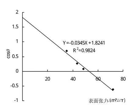 參照Zisman作圖法,選取潔凈、無病斑的劍麻葉片,用刀片切成規則平整的小塊(避開葉脈),用膠水將其固定在載玻片上,使用微量注射器分別吸取2μL已知表面張力的液體(乙二醇、DMSO、DMF和去離子水),點滴在劍麻葉片表面,置于接觸角測量儀上,記錄此時液滴所成的接觸角θ,每個處理重復10次,取平均值。以這4種液體的表面張力值為橫坐標,cosθ為縱坐標,得到一條直線回歸方程,在cosθ=1(接觸角為0)處得到相應的表面張力值即為劍麻葉片的臨界表面張力值。