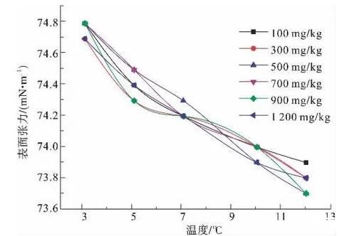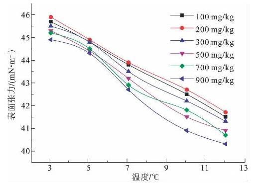 圖6為100、200、300、500、700、900 mg/kg濃度下,非離子表面活性劑P123溶液的表面張力隨溫度變化示意圖。由圖6可知,隨濃度增大,溶液降低表面張力的能力逐漸增大,但各個濃度曲線差值不大,900 mg/kg濃度溶液表面活性最強。在所測溫度范圍內,整體上表面張力曲線幾乎呈直線狀,遵循隨溫度升高而表面張力降低的一般規律,斜率幾乎不變,未出現拐點,且相差較大,同一條曲線3℃和12℃表面張力值相差4.2~4.6 mN/m。