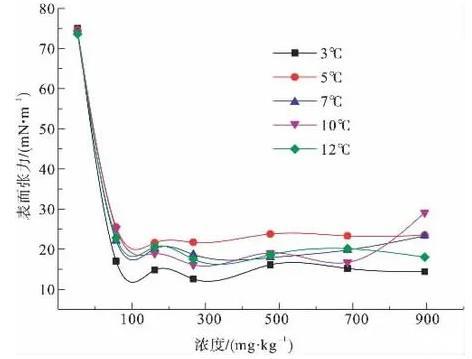 圖2為3、5、7、10、12℃下,陰離子表面活性劑CTAB溶液的表面張力隨濃度變化示意圖。由圖2可知,CTAB是比較優良的表面活性劑,在低濃度下就能夠顯著降低溶液表面張力,在300 mg/kg-1時表面張力達到最低值,之后隨濃度增大,表面張力變化不大,因此CTAB的臨界膠束濃度CMC即在此濃度范圍附近。在所測溫度范圍內,當CTAB溶液達到CMC以后,表面張力值在14.5~23.5 mN/m之間。隨溫度變化,表面張力值相差較大。