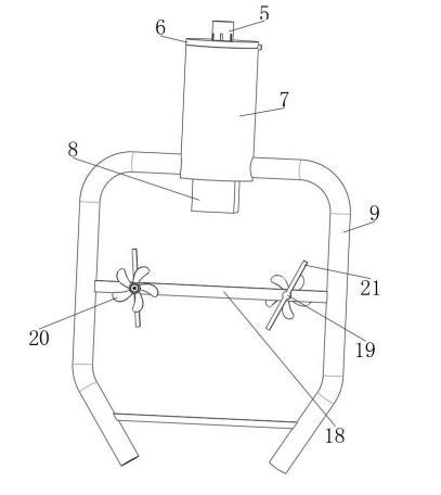 步驟三:在兩根出液管帶動(dòng)加強(qiáng)桿轉(zhuǎn)動(dòng)的同時(shí)將帶動(dòng)渦輪葉片轉(zhuǎn)動(dòng),使轉(zhuǎn)動(dòng)的渦輪葉片能夠通過轉(zhuǎn)軸帶動(dòng)攪拌桿轉(zhuǎn)動(dòng),使攪拌桿對(duì)混料桶內(nèi)的試劑溶液進(jìn)行橫向攪拌混合,提高混合效果。