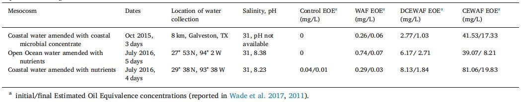 海水是從墨西哥灣收集的,用于填充 12 罐,每個 130 L,其中 4 個處理一式三份: 對照(海水)、WAF(用 Macondo 替代油,一種輕質(zhì)低硫原油,化學(xué)性質(zhì)類似于 在深水期間從 Macondo 井中溢出的石油 Horizon 事件)、CEWAF(Corexit + oil 比例為 1:20)和 DCEWAF (CEWAF 稀釋十倍)。 仔細(xì)描述了中間宇宙的設(shè)置 在韋德等人。 (2017) 以及準(zhǔn)備 WAF 的程序, CEWAF 和 DCEWAF。 簡而言之,注入油或油 + Corexit 進(jìn)入帶擋板的再循環(huán)罐并混合約 24 小時,然后將下層 分?jǐn)?shù)(即,避免表面光滑)被添加到各自的 坦克。 有關(guān)中宇宙實驗的信息在表 1 中給出 根據(jù)估計值添加初始和最終油濃度 根據(jù) Wade 等人確定的油當(dāng)量 (EOE)。 (2011 年,2017 年)。 實驗持續(xù) 3 到 5 天,運(yùn)行 12:12 明暗循環(huán)。 在表 1 中,對于使用沿海 用微生物濃縮物修正的水域,浮游生物(≥63 μm)是 用網(wǎng)收集并轉(zhuǎn)移到聚碳酸酯瓶中。 這個 將濃縮的浮游生物塊引入罐中并攪拌(2 L 到每個)在開始實驗之前。 對于公海水域和沿海水域的中宇宙,營養(yǎng)物質(zhì)進(jìn)行了修正, 添加營養(yǎng)物(最終濃度 f/20)并攪拌罐。